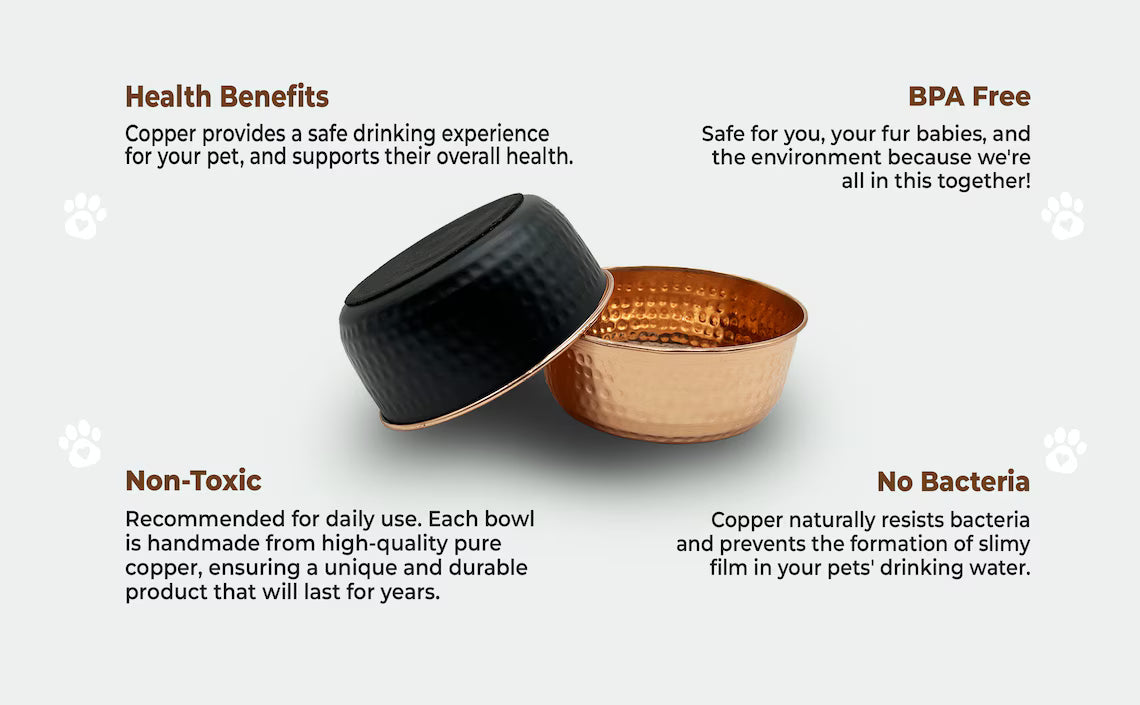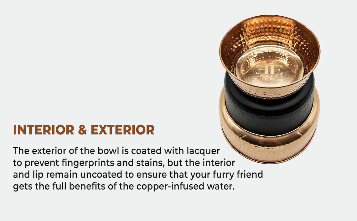 100% PURE COPPER CONSTRUCTION: COPPER OXIDIZES NATURALLY, THIS IS NOT A DEFECT. Natural oxidation creates unique brown, black, or aqua-green tints. This isn't a flaw but a distinctive feature showcasing their authenticity. The rate of oxidation may vary depending on the type of water being used. All our bowls are safe and easy to clean with our included guide. All our bowls are expertly handmade and free from harmful chemicals, ensuring a healthy and happy experience for both you and your pet.