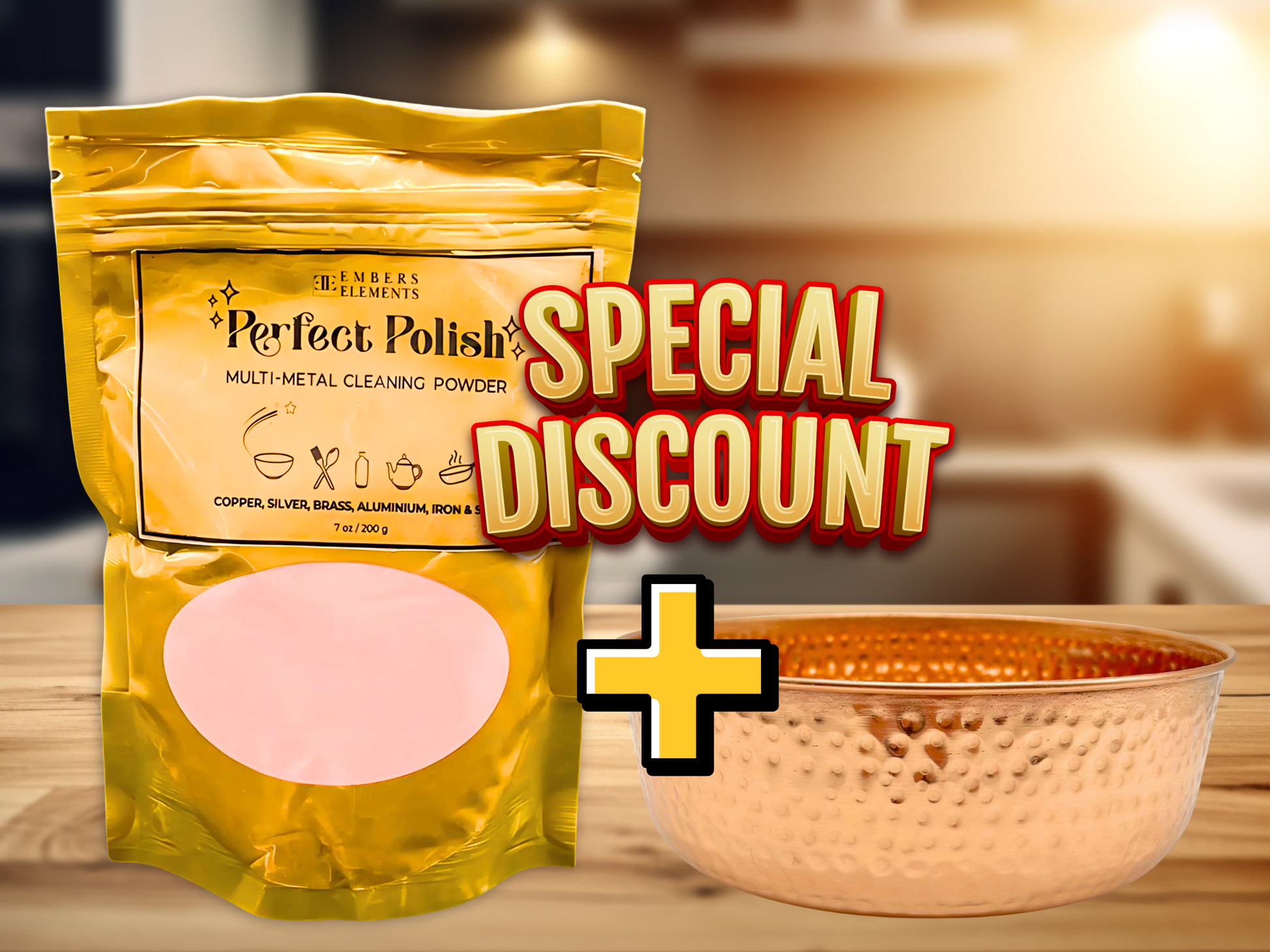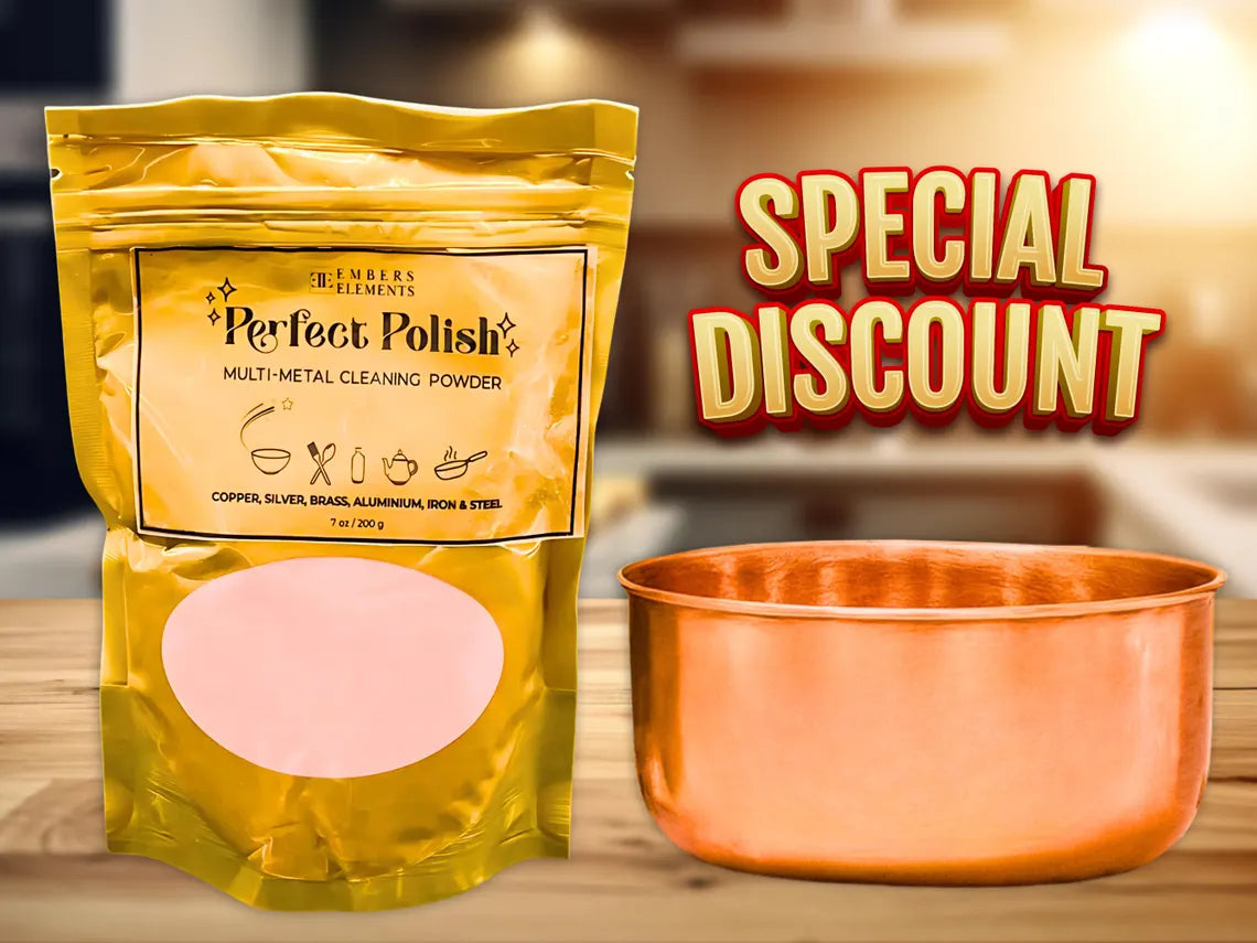 Perfect Polish is your go-to cleaner for restoring the rich, natural glow of copper bowls and other metal items. Designed with a fast-acting, diamond-cutting formula, this gentle yet powerful powder removes tarnish, oxidation, stains, and grime — all without scratching delicate surfaces. Infused with a refreshing Kewda-Sandalwood fragrance and made from non-toxic, pet-safe ingredients, it’s the perfect way to care for your copperware and more.