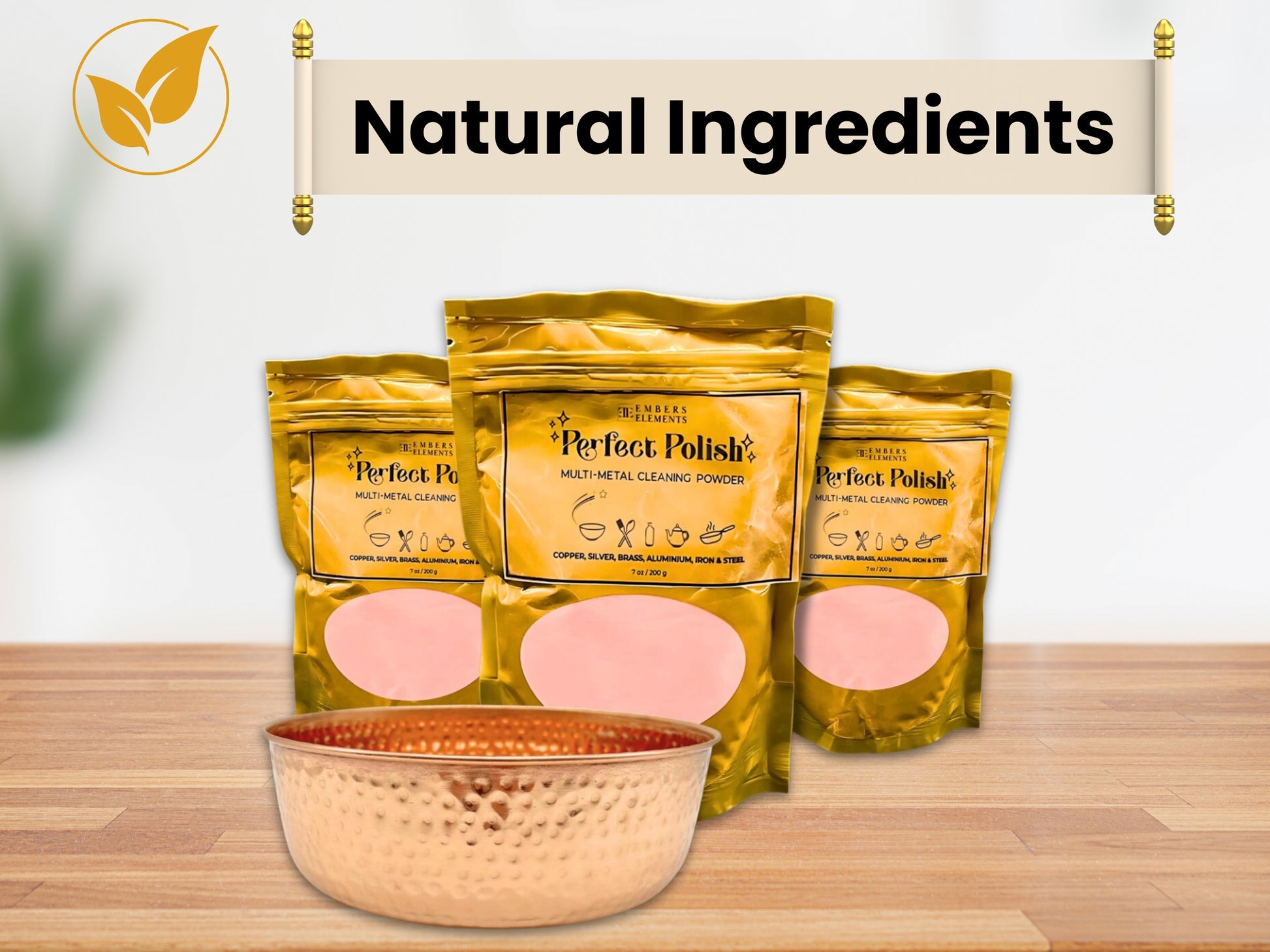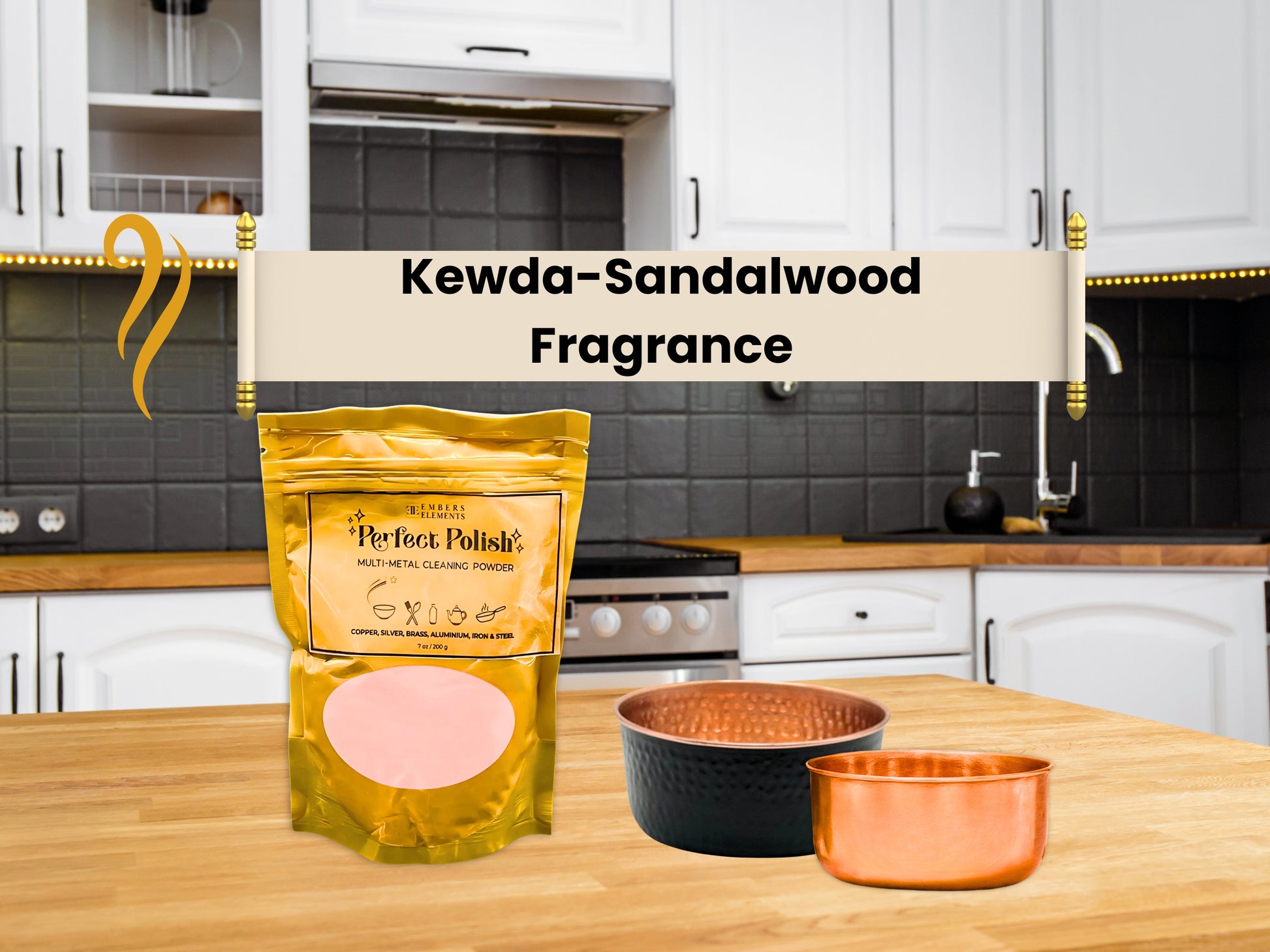 Perfect Polish is your go-to cleaner for restoring the rich, natural glow of copper bowls and other metal items. Designed with a fast-acting, diamond-cutting formula, this gentle yet powerful powder removes tarnish, oxidation, stains, and grime — all without scratching delicate surfaces. Infused with a refreshing Kewda-Sandalwood fragrance and made from non-toxic, pet-safe ingredients, it’s the perfect way to care for your copperware and more.